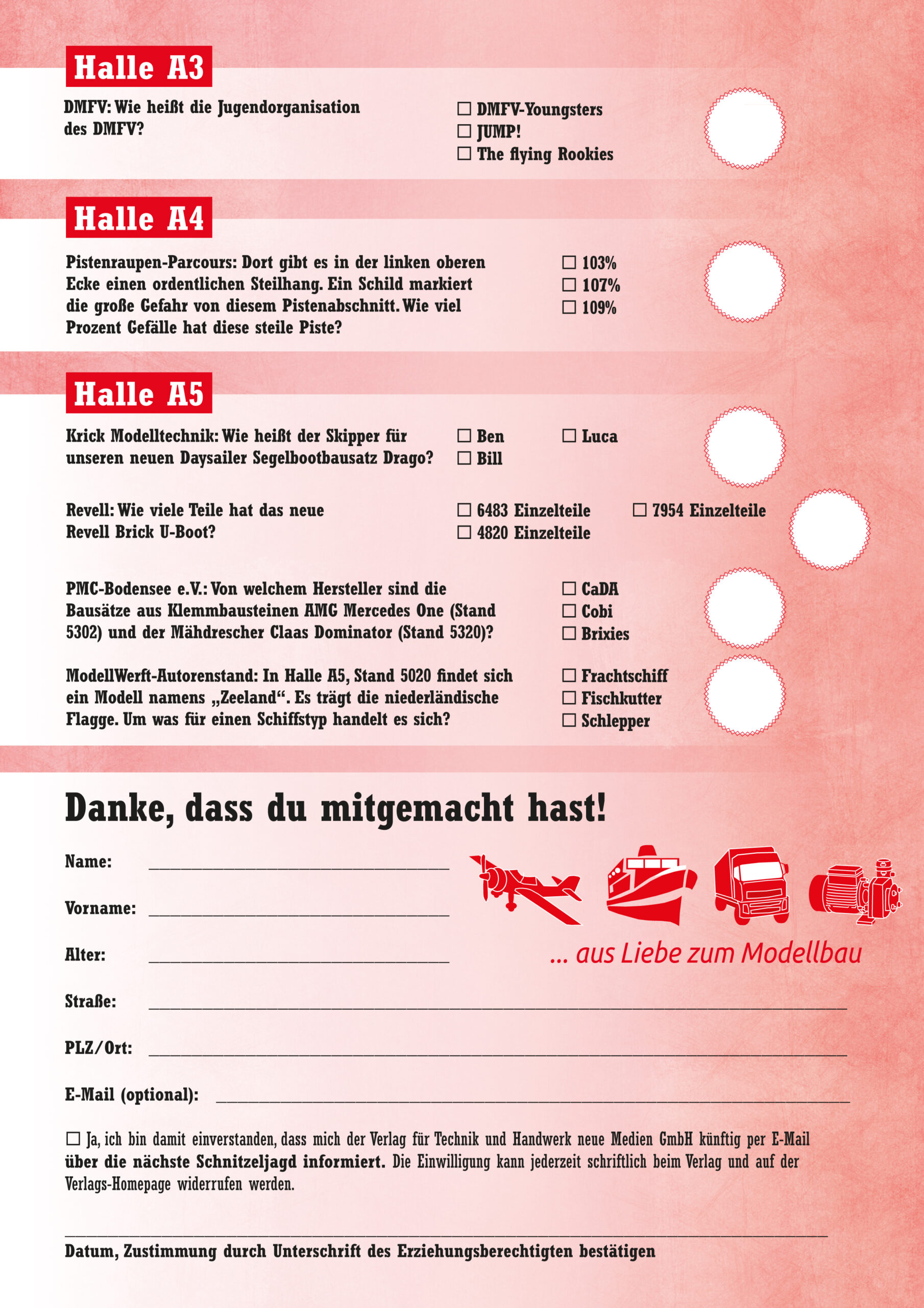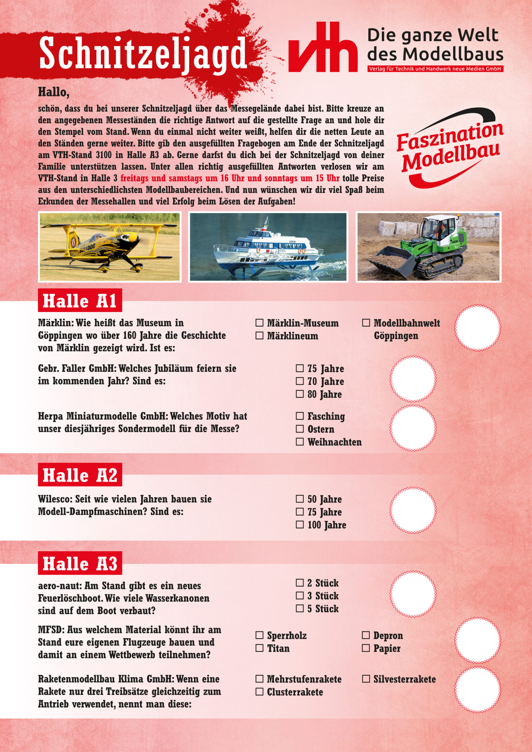 Bitte gebt den ausgefüllten Fragebogen am Ende der Schnitzeljagd am VTH-Stand in der Halle A3 ab. Unter allen richtig ausgefüllten Antworten verlosen wir am VTH-Stand in Halle A3, Stand-Nr. 3100 am Freitag und Samstag um 16 Uhr und Sonntag um 15 Uhr tolle Preise aus den unterschiedlichsten Modellbaubereichen.