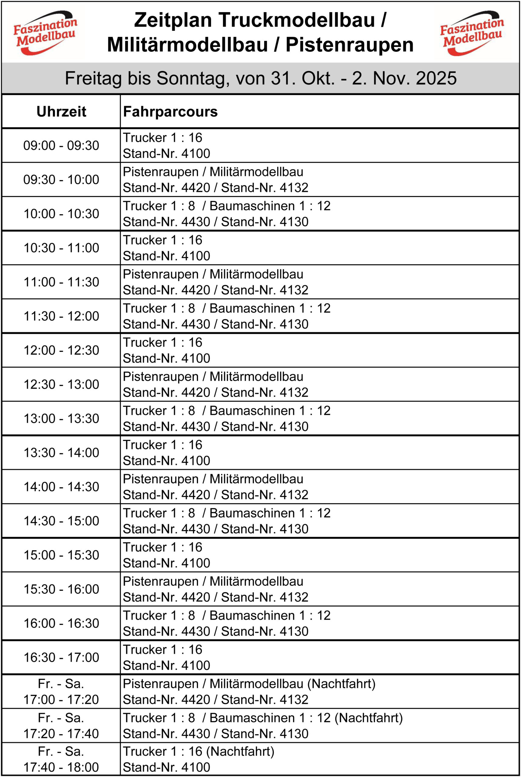 Auf den über 600 qm großen Truckparours in den Maßstäben 1 : 8 und 1 : 16 sind die Modelltrucks in ihrem Element. Für die detailliert und liebevoll gestalteten Miniaturwelten werden über 160 m³ Erde in der Halle verteilt und modelliert, Hunderte von Pflänzchen zu Naturlandschaften arrangiert, Saatgut ausgebracht, Straßen und Kreuzungen angelegt und zahlreiche Gebäude und Anlagen erbaut. Engagierte Vereine tüfteln bereits Wochen vorher und jedes Jahr aufs Neue über maßstabsgetreuen Gestaltungsplänen. Nach der langen Vorbereitungszeit werden die „blühenden Landschafen“ endlich mit Leben erfüllt: Traktoren bestellen die Felder, auf der Baustelle herrscht Hochbetrieb und mit Hilfe zahlreicher Trucks ist ein eifriger Be- und Entladeverkehr im Gange.